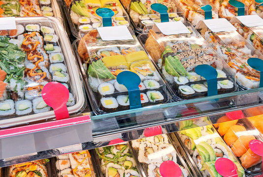 Assortment of packaged sushi trays displayed in refrigerated section at grocery store. Asian food for take away in supermarket shelf. Food retail background