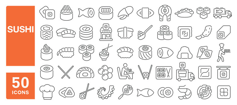 Set of 50 line icons related to sushi, seafood, chopsticks, rice, nori, caviar, sushi roll, Editable stroke. Vector illustration