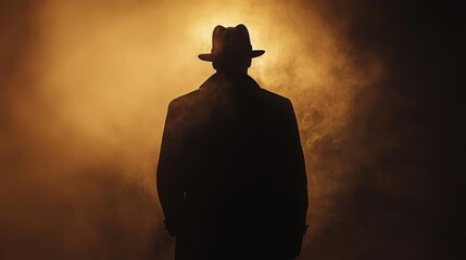 Mysterious figure in a hat stands in foggy light, casting an enigmatic shadow. The atmosphere feels suspenseful yet intriguing.