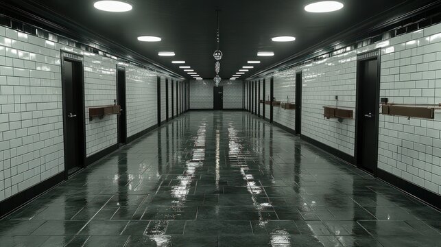 Dark hallway, tiled walls, reflective floor, hotel corridor, suspenseful mood, film scene
