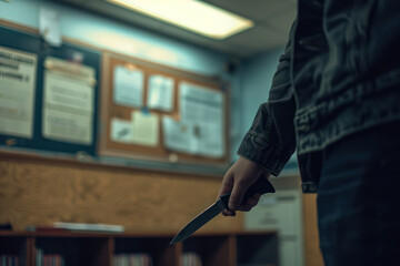 Mystery Thriller Scene with Ominous Figure Holding Knife in Dimly Lit Library Ambiance. Concept of the fight against terrorism or anti-terrorism.