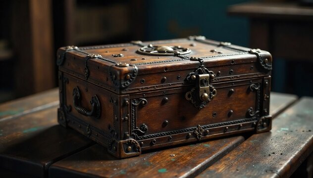 Intriguing antique wooden box, intricately carved, sits on a dusty table, revealing a mysterious glint within A captivating image for mystery novels, escape rooms, or antique shops , vintage, locked
