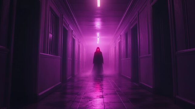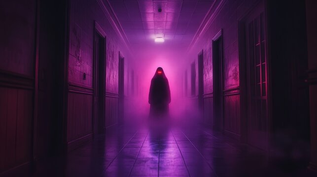 Mysterious Figure in Hallway with Glowing Red Eyes