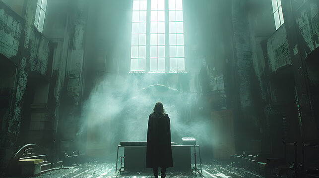 A mysterious figure stands before a grand piano in the midst of a foggy, abandoned building, evoking a sense of suspense