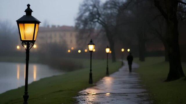 Stalking a solitary figure walks along lamplit waterfront at dusk—serene yet suspenseful scene hinting at quiet pursuit or unseen watcher