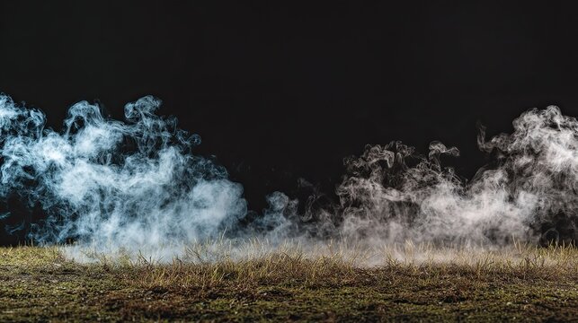 The vast expanse of pitch-black land, from which white smoke rises, creates a strong atmosphere of mystery and intrigue, suitable for visual storytelling or art installation design.