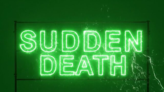 Intense neon sign flashes 'SUDDEN DEATH' with electric sparks, creating a dramatic and urgent visual for suspenseful content, gaming, or horror projects