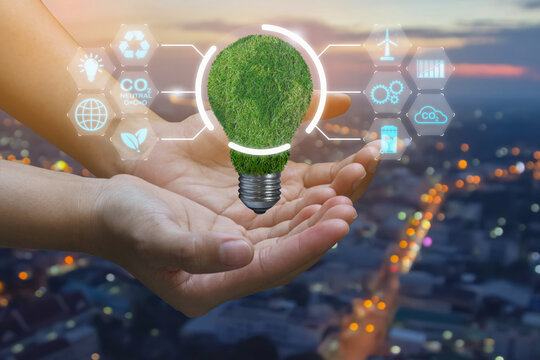 Hand holding green world map on light bulb, Renewable energy and sustainable development - Ecology and global sustainability concept. Saving environment on with a renewable energy source with icons.