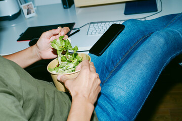 Green food, environmental concept. Hand holding fork with leaves and globe. Element of this image are furnished by NASA