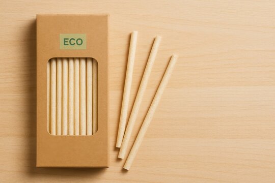 Biodegradable drinking straws made from rice or wheat in eco kraft packaging with green label - sustainable product concept with space for text.