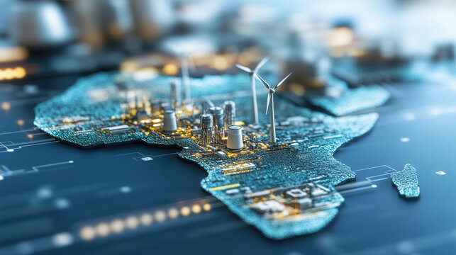 3D view of Africa shape outlined by energy infrastructure, showcasing wind turbines and modern technology, symbolizing sustainable development and innovation