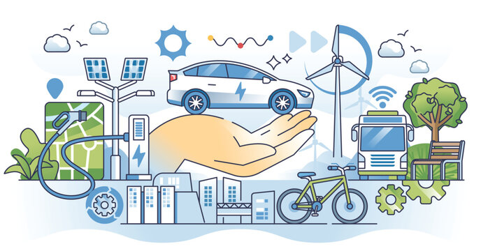 New mobility / sustainable transportation vector. E-mobility, urban, alternative or public transportation by rail, tram/bike, city infrastructure, commute, carbon emission reduction. Vector banner.