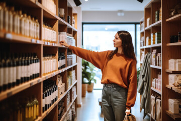 A candid image of a woman keenly browsing natural, eco-friendly cosmetic products in a store, reflecting a conscious, sustainable lifestyle