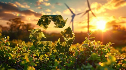 Green recycling symbol with sunrise over a field with wind turbines. Green energy solutions and sustainable power engineering and eco-friendly technology. Generative AI