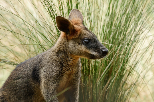 A shy swamp wallaby (Wallabia bicolor), also known as a black wallaby, keeps a wary eye out. The small marsupial, found in Australia, has distinctive colouring.