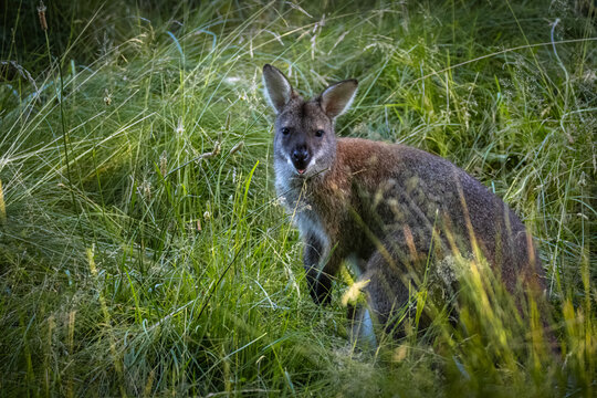 A swamp wallaby feeds on the local vegetation in Wilsons Promontory national park, Victoria, Australia