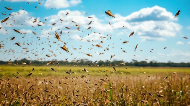 Flocks of locusts take to the skies, showcasing a captivating natural phenomenon of swarming insects