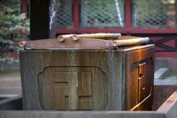 Japanese traditional ablution pavilion adorned with a carved Buddhist swastika cross.