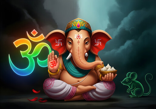 Meditating Hindu god Ganesha with glowing Om symbol.