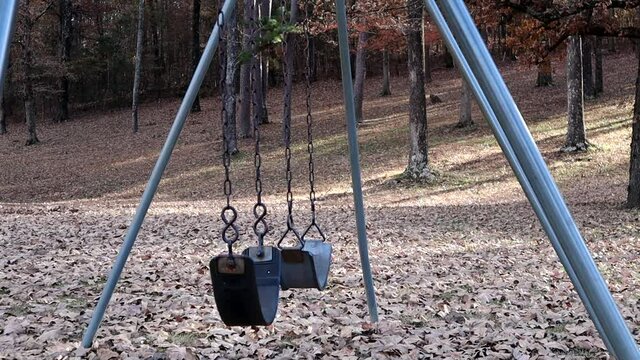 The swings on an empty playground sway in the breeze on an autumn afternoon