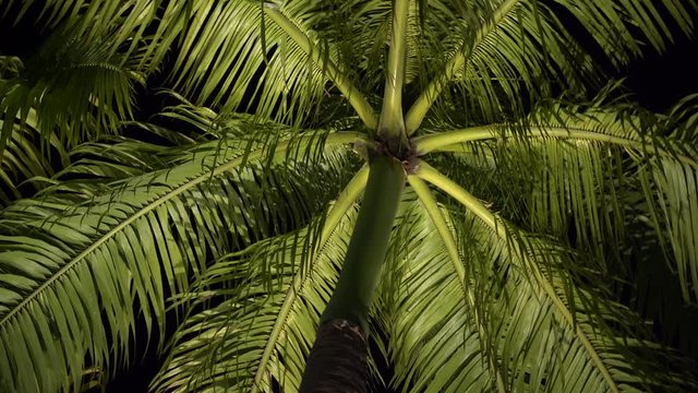 View of the green palm leaves, which are illuminated by artificial lighting at night, Singapore . Tropical palm leaves sway from the wind
