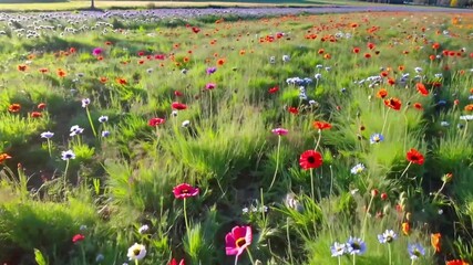 spring wildflower field in sunlight slow motion with poppies and cornflowers gently swaying in the breeze vibrant nature scene