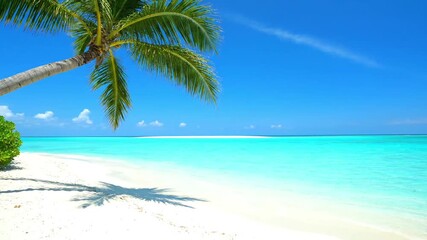 Relaxing getaway with turquoise sea and palm trees swaying in the breeze on sunny day