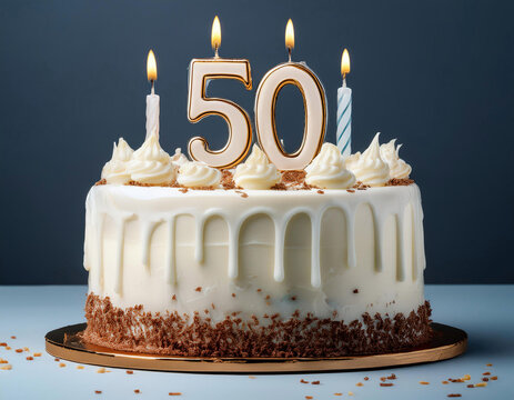 A white frosted birthday cake decorated with lit candles and the number "50" burning candles on top is displayed against a dark blue background.