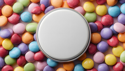 Blank white round sticker mockup on birthday or baby shower party favor bag with colorful candies, top view, close-up, dramatic atmosphere. White tone