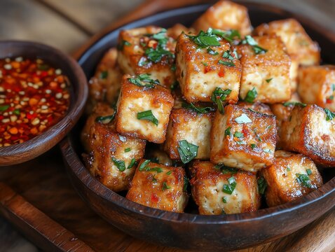 Thaistyle deepfried tofu with sweet chili sauce, Thai deepfried tofu, vegetarian appetizer