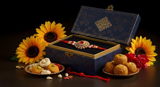 Rakhi Celebration: A vibrantly-colored scene of a Rakhi with sweet delicacies and Sunflowers arranged around a decorative box.