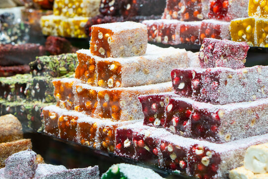 .Traditional oriental sweet pastry cookies, nuts, dried fruits, pastilles, marmalade, Turkish desert with sugar, honey and pistachio, in display at a street food market