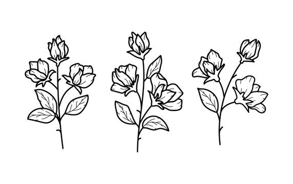 Sweet pea flower and leaf drawing illustration with line art on white backgrounds.