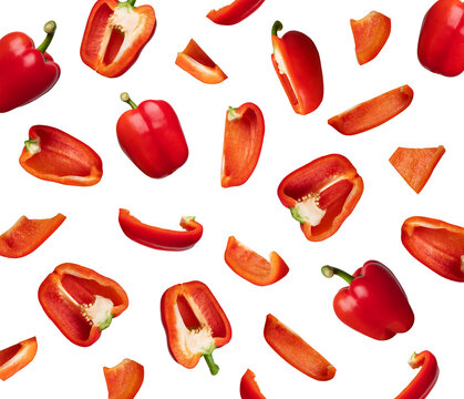 Pattern of whole and sliced red fresh bell pepper isolated on white background. With clipping path. Cut out sweet pepper for your design, mockup for advertising. Vegetable background