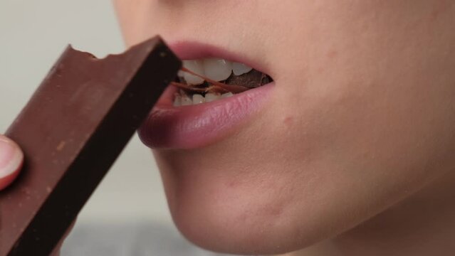 Young Caucasian woman eating chocolate bar close up indoors apartment background. Sensual brunette girl biting sweet candy with satisfaction on face. Unhealthy nutrition sugar addiction. Tasty food