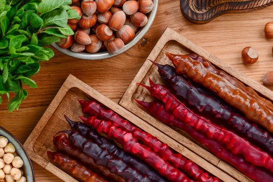 National Georgian sweet dish - churchhela on a wooden table. Fruit juice with hazelnut or walnut. Flat lay, top view