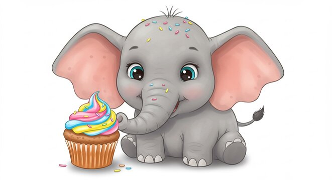 Adorable baby elephant playfully enjoys colorful cupcake sweet treat. AI Generated