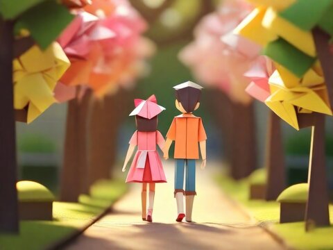 The childhood sweethearts walked hand in hand origami style, AI generated