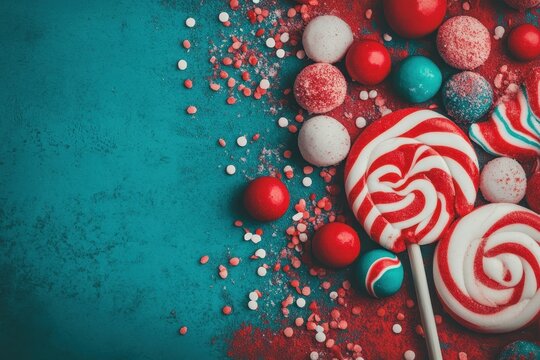 Colorful candy assortment with bright red and white lollipops on a turquoise background