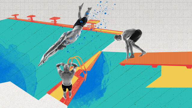 Muscular, athletic man, professional swimming training in pool, preparing for competition. Contemporary art collage. Concept of professional sport, game, active lifestyle. Banner, flyer, ad