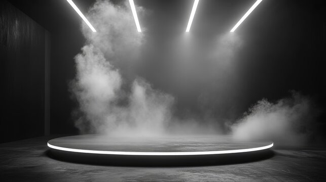 Empty stage with directional white lighting on a transparent background, featuring floating smoke for product demonstrations.
