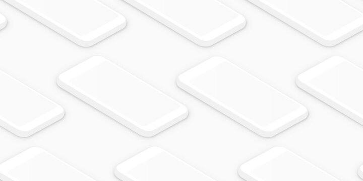 Clean white isometric smartphones. Realistic empty screen phones seamless pattern. Empty screen phone template for inserting UI interface or business presentation. Soft 3d vector design