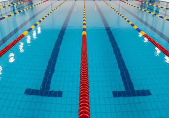 Swimming pool lanes with blue water are clearly marked by colorful floating lane markers