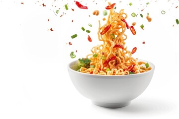 A steaming bowl of chicken noodle soup, each element exuding warmth and comfort: tender pieces of chicken, al dente noodles, and vibrant vegetables floating in a rich, golden broth