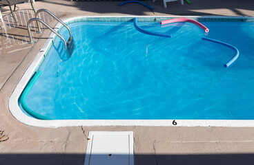 Red pool noodle floating in crystal clear water in swimming pool. Leisure and swimming concept.