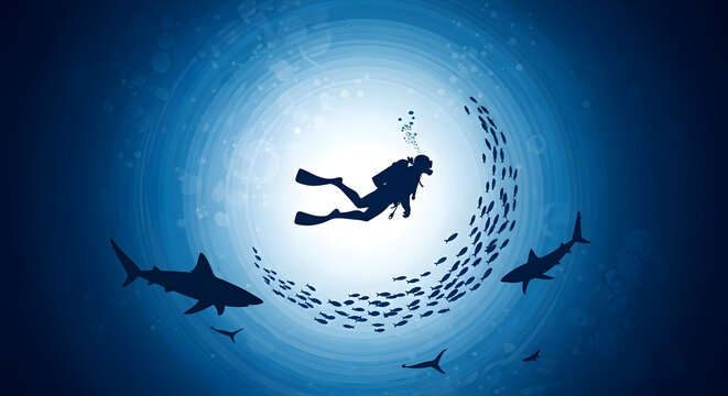 Silhouette Diver Swimming with Fish and Sharks in Deep Blue Sea