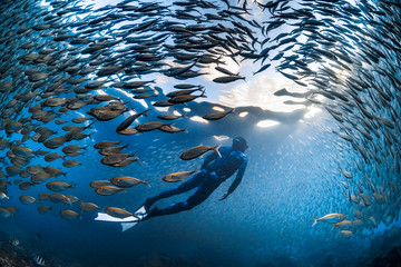 Diver diving undersea amidst shoal of fish