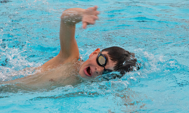 Closeup of a young boy swimming freestyle in a swimming pool.