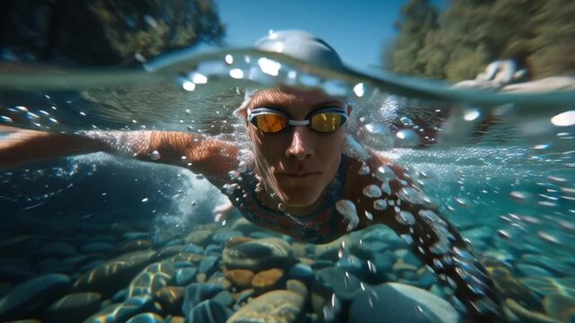 Endurance in Nature's Embrace: A swimmer, poised and determined, slices through crystal-clear water, the surrounding stones and lush trees offering a scenic backdrop.
