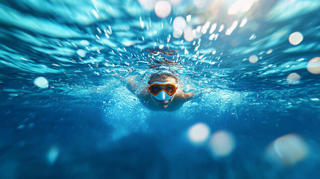 Underwater Swimmer: A determined swimmer glides through the crystal clear water, captured from a unique underwater perspective, showcasing the power, focus, and grace of a skilled athlete.